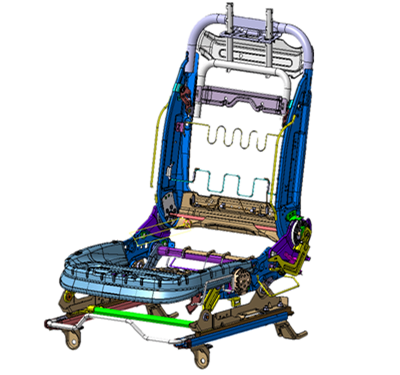 靠背框結(jié)構(gòu)為三個(gè)沖壓件與U型管焊接的結(jié)構(gòu),主動(dòng)式頭枕利用杠桿原理,采用人體對(duì)座椅的沖擊力觸發(fā)頭枕,實(shí)現(xiàn)頭枕向上,向前運(yùn)動(dòng)以保護(hù)乘客的頭部。座框采用四連桿結(jié)構(gòu),通過(guò)高調(diào)器驅(qū)動(dòng)座框上的齒板,齒板又帶動(dòng)四連桿機(jī)構(gòu)運(yùn)動(dòng),從而實(shí)現(xiàn)座椅的高度上、下調(diào)節(jié)。